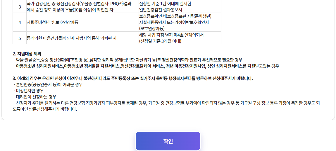 전체 동의를 하고 다음 단계로 넘어오시면, 전국민 마음투자 지원에 대한 서비스 대상, 서비스 이용 및 신청방법, 온라인 신청서 작성 전 주의사항을 차례로 확인하시고 '확인' 누르시면 됩니다.