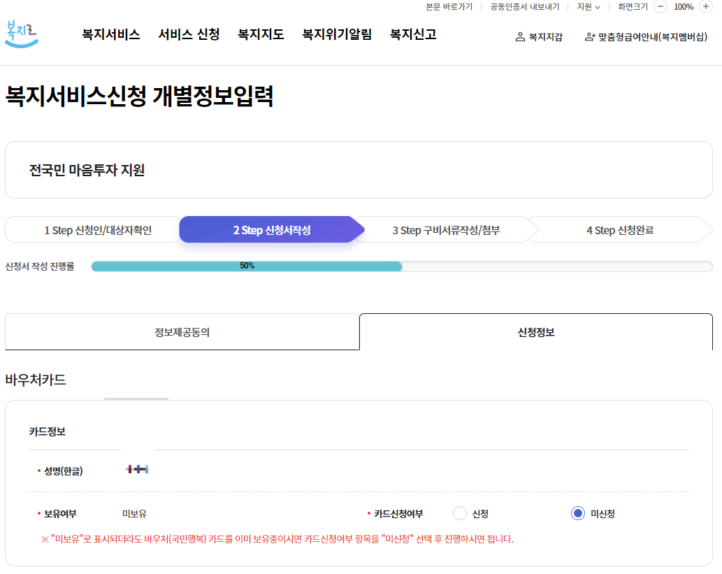 '국민행복카드'에 바우처가 제공될 예정이기 때문에 '국민행복카드' 없으신 분들은 카드신청여부에 '신청'을 체크하시면 됩니다.