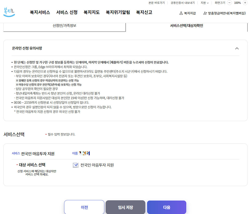 해당 가족과 신청인과의 관계를 모두 설정하고, 개인정보를 모두 입력하시고 '다음' 누르시면 다음 탭의 '서비스 선택/ 대상자 확인'에서 이름 확인, '전국민 마음투자 지원' 체크하고 '다음' 누릅니다.